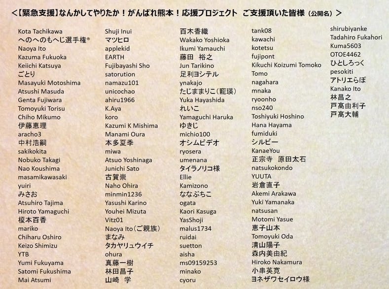 2016/05/19 17:16平成28年4月14日午後9時26分ごろ、熊本県益城町で震度7を観測する地震が発生しました。 FAAVO長崎としまして、「平成28年熊本地震」の影響で、お亡くなりになられた方のご冥福を心よりお祈り申し上げ、被災された方へのお見舞い申し上げます。 FAAVO長崎事務局です。 いつも温かいご支援をありがとうございます。 今回のプロジェクトにおきましてご支援頂きましたこと、多くの「いいね!」を頂き、また投稿の記事シェア頂くことで想いを共に寄せて頂きましたこと、深く感謝申し上げます。 今回、全国の皆様よりたくさんのご支援を頂きました。 本来ならば、おひとりおひとりに直接お会いしてお礼を申し上げたい気持ちでありますし、その届けて頂いたお気持ちを日本赤十字社長崎支部を経由して、責任もって被災地へ届くよう努めることが、私どもFAAVO長崎事務局の責務と思っています。 大変恐縮ではございますが、今回ご支援頂いた皆様のお名前(公開名)をひとつに掲載させて頂いています。 これからも、被災地の復興へと繋がるよう日常の生活の中においても、また勤務している状況におきましても、些細なことからでも気にかけ力になれたらと思っています。 少しでも平穏な生活に戻りますこと願っております。 もっと見るプロジェクト終了しました。ありがとうございました。