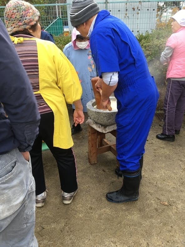 英語でおもてなしガイド養成講座~屋外編お餅つき大会にて(尼崎市大庄地区 於:水明公園) 今、尼崎市は来年3月29日の尼崎城グランドオープンに向けて様々なイベントや取組みが企画されております。インバウンドの増加も期待されており、シンフォニーもそうした新しく訪れた外国の方たちに尼崎を知って頂こうと、お城のこと、まちのことなどを英語で案内をできる人を養成しようと毎週土曜日に英会話講座を開催してます。講師は尼崎で生まれ育った81歳のスーパーシニアが努めます!この日(12/22)は、日本の文化を外国の方たちに知ってほしい。ガイドをしたい方にも体験していただこうと教室を出て、町内会の協力を得て餅つき大会を行ないました。撞いたお持ちは、きなこ餅、おろし餅、おぜんざいにしてみんなで食べました!「参勤交代カフェ」は、おもてなしガイドの活動拠点としても活用していきます。
