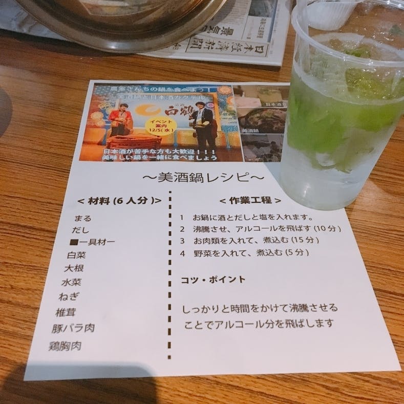 篠山で採れた新鮮な野菜を使った美酒鍋と日本酒を使ったカクテル