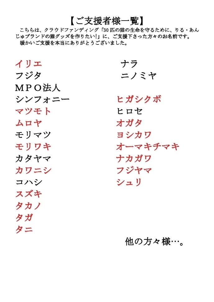 2019/08/26 22:15暑さもやっと峠を越したようですが、皆様はいかがお過ごしでしょうか。 りる・あんじゅ理事長の藤山です。 「30匹の猫の生命を守るために、りる・あんじゅブランドの猫グッズを作りたい!」プロジェクトに支援して頂いた26名の方や直接りる・あんじゅ口座に、振り込んで頂いた皆さんには、本当に心から感謝しております。ありがとうございました。 ご支援いただけたことに感謝し、報いようと、猫グッズ制作に取り掛かりましたが、思いの外上手く行かず、試作を重ねるも失敗続き、予定通りのお届けが叶わないと思い、その旨をご連絡しようとするのも、支援者の方々の名簿の出し方が分からず、途方に暮れていましたところ、活動資金が、不足してしまい資金調達ためにチャリティーストリートライブを始めましたら、予想以上に忙しく、益々猫グッズ製造が溝り予定よりも半年も過ぎて、支援者の方も未だ把握しきれない状況でありましたが、やっと詳しい方に教えていただき、支援者の方の名簿を閲覧することが出来ました。 大変お待たせして申し訳ございません。 そして、私自身も重度の身体障害のため介護者の方にお手伝いをして頂きながらの製作になりますので、日々の活動の中、費やせる時間が少な過ぎ、まだ暫くお待たせしてしまうことと思いますが、どうか気長にお待ち頂けましたら幸いです。 どうか、よろしくお願いいたします。 ※ 尚、リターン品のうち猫カレンダーの方は、クラファンの中では(2019年4月始まり)としていましたが、製造が間に合わず、遅れてしまいましたので2020年度1月のものに変えて、来年に出来るだけ間に合うように、今年中に送らせていただきます。 夏バテは秋に出るとも申しますので、お気をつけください。 NPO法人 地球がよろこぶお店 りる・あんじゅ 理事長 藤山富士美 ここに、クラファンでご支援して下さった皆さまのお名前と、直接りる・あんじゅにご支援して下さった(確認の上で)お名前を公開致します。 もっと見るキャット・カフェりる・あんじゅのマッサージ猫ちゃん。