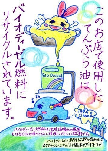 その頃、ちょうど廃食油の回収に協力してくれている飲食店さん向けのポスターを作りたいと思っていて、できれば子どもウケするようなかわいらしいイラストの方がいいなぁと考えていたので、絵を見た瞬間に一目惚れして、その場で依頼しました。