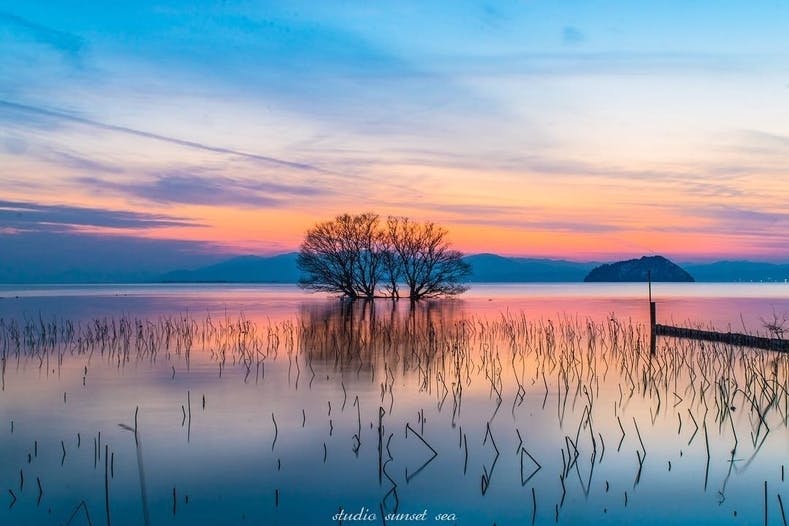 びわ湖に浮かぶ、印象的な水中木。夕空のグラデーションが、滋賀らしい一枚。この作品は、1月のカレンダーに使わせてもらう予定です。