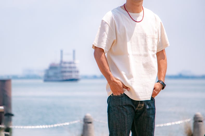 そんなビワコットンの、クルーネックポケットTシャツです。色は、写真と同じ「キナリホワイト」。ご注文時、サイズを備考欄に記入ください!