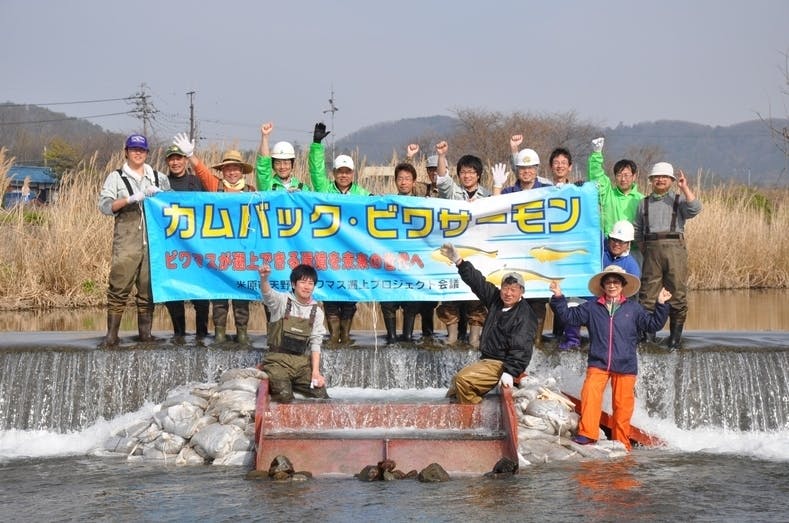 天野川とその支流の丹生川が合流する地点(琵琶湖から約7キロ地点)までビワマスが遡上できるように、堰堤(せきてい)が原因でビワマスの遡上が難しい場所に、平成24年から約3年の歳月をかけて簡易魚道を設けました。そして現在は、滋賀県の事業により現在は5か所の本格魚道が設置されています。