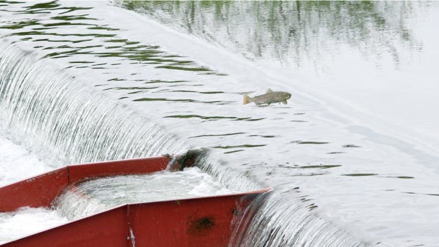 (簡易魚道を遡上するビワマス)