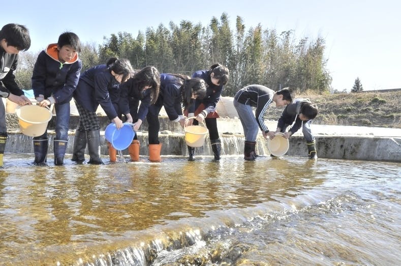 (小学校で育った稚魚の放流)