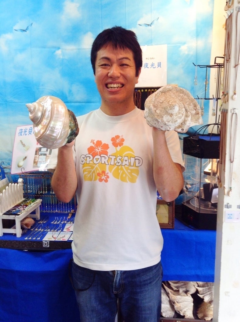 沖縄の国際通り裏、悠ヶ風という3坪の小さなお店で、夜光貝アクセサリーを製作している伊敷 建(いしき たける)です。