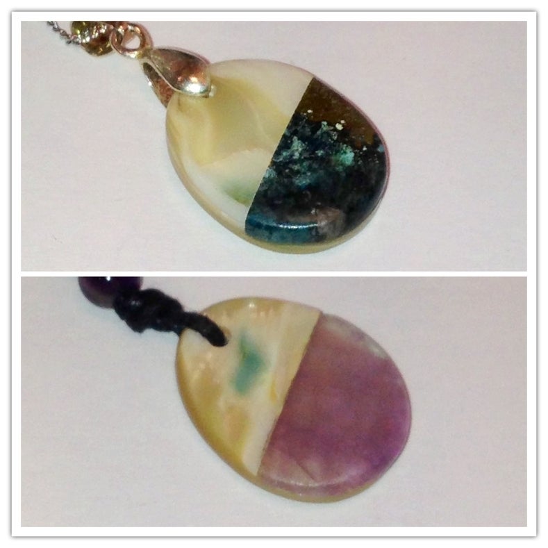 上がターコイズと一体化させたもので、下がアメジストと夜光貝を一体化させたネックレスです。