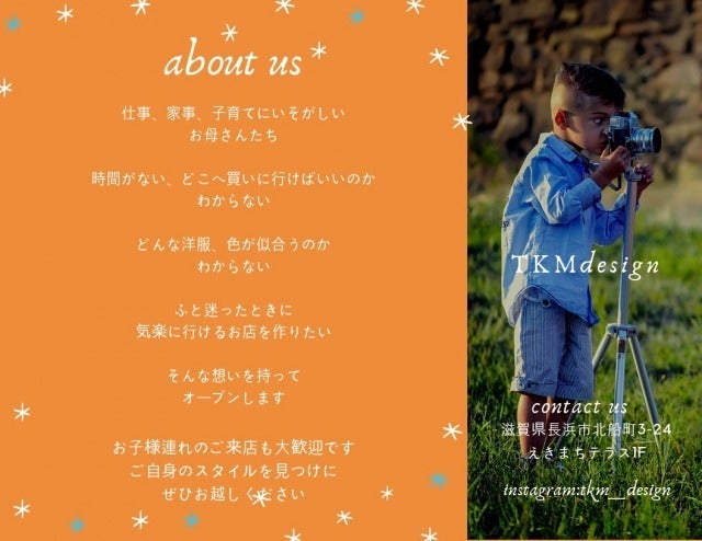 新しくオープンするTkm designでスタイリストがコーディネートをした服を親子で試着!プロのカメラマンが撮影し、写真をプレゼント。イベント参加費は無料です!