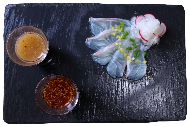 鯛の刺身を2種類の中華ドレッシングにつけて食べる・・・ビール、チューハイ、ハイボール、なんでも来いの万能な一皿です。