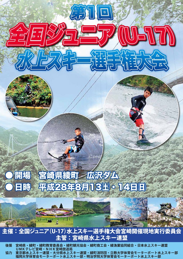 全国の水上スキ-プレイヤー(17歳以下)が宮崎県綾町にある広沢ダムに集まり、日本初のジュニア選手のみの水上スキー選手権大会を開催します。全国の選手たちにとってそれぞれの練習場所が大きく離れているため、ライバルとなるジュニア選手との交流を持つ機会が多くありません。今回、この全国ジュニア(U-17)水上スキー選手権大会を行うことによって、全国の選手が交流する機会を増やし、よりハイレベルな競技へと発展させて行くために、本大会の2日前からジュニア選手の強化合宿を行います。水上スキーで有名な福岡大学や立教大学のOB・OGをコーチとして招き、ジュニア選手達の技術サポートに入ってもらうことで、より高いレベルの合宿を経験してもらい、今後水上スキーのジュニア選手達が「全国ジュニア(U-17)水上スキー選手権大会」へ出場することに意味があると思ってもらえるような大会にしたいと思っています。