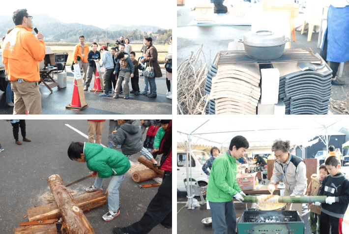 左上:イベントには地域の子どもたちもたくさん参加してくれました/右上:軒下に積んであった100枚の瓦で作ったロケットストーブ、いざという時には大活躍します/左下:間伐材を利用した丸太切り体験も子どもたちには新鮮な遊びになります/右下:山の厄介者・孟宗竹も、手作りのバームクーヘン作りに活用。工夫次第でいくらでも再利用の方法はあるのです
