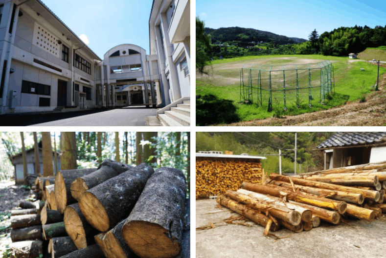 左上:2013年に閉校になった富山小学校。近代的な校舎ですが、今では人影もなく、ツバメたちの夏の別荘地になっています/右上:大きな野球場にも人影はありません。右下/10年に渡って炭焼きをされている粘り強い人たちもおられます/右下:こうした間伐材・林地残材を薪などに加工・販売し、少しでも収入に変えていく新しい仕組みを作っていきます