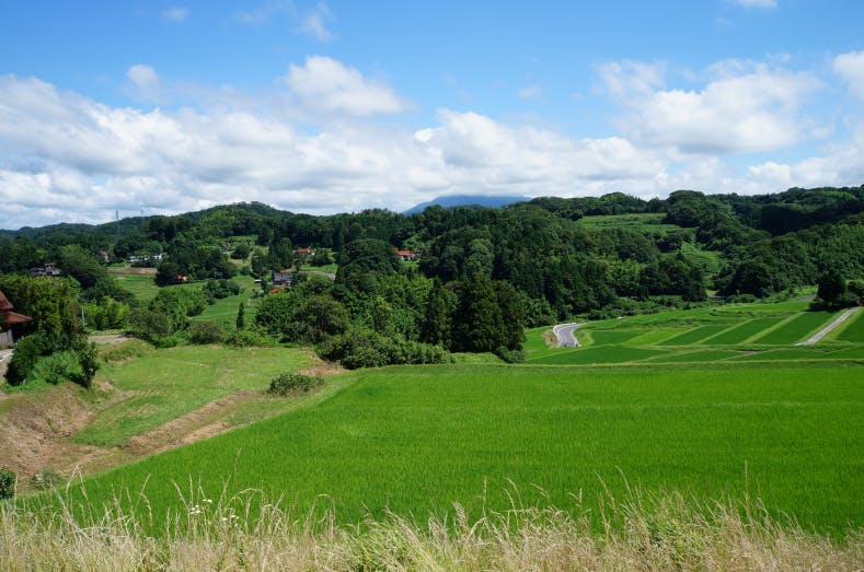 高台から望む富山町の美しい棚田。雲のない日には遠くに三瓶山が頭をのぞかせます!
