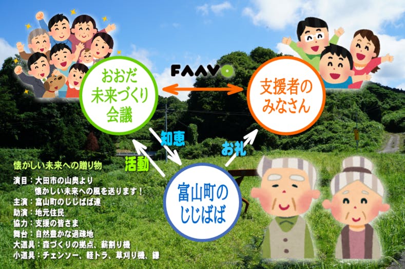 「おおだ自然エネルギーパーク」は僕たちにとっては、あくまでキッカケづくり。ここから"自然といっしょに、楽しく生きる"ための具体的なアクションに、活動を拡げていこうと思っています。それが、今回、皆さんの力をお借りして取り組もうと考えている「じじばばが元気になる森づくり。木の温もりで次世代とつながるプロジェクト」です。高齢化や輸入木材の台頭など、あらがえない時代の流れによって、これまで無残にも見放されていた大田の森にもう一度着目し、徐々に価値ある里山の森に生まれ変わらせていきたいと考えています。自然の本来持つ力、大地の恵みのパワーに注目が集まりつつある時代が今訪れつつあります。それは、グローバル経済の中でも負けない"小さくても強い田舎"づくりのためのチャンスだと、僕たちは信じています。ひとつの小さな森づくりを、大田市の未来を変えていく活力につなげていきたいと思っています。目指せ、スモール・イズ・パワフルです!