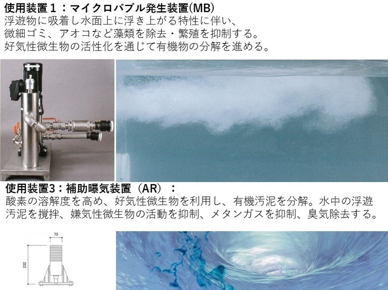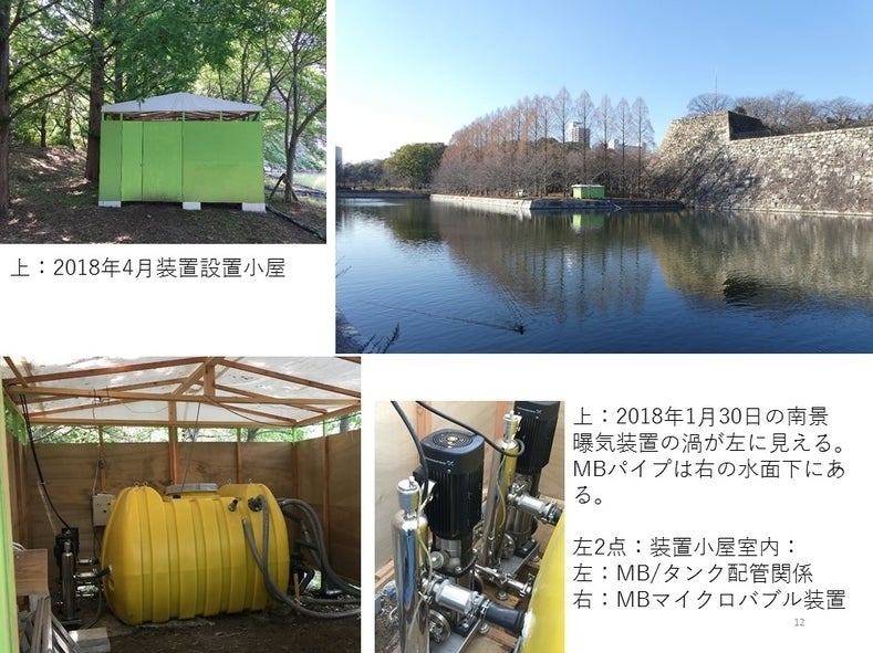 ・曝気装置により緩やかな渦を描く。いずれも、水中設置のパイプを利用する。アオコに関しては、濠水20t/hの使用時にオゾン処理を行う。生物に影響がないレベルで、アオコを70%処理する。