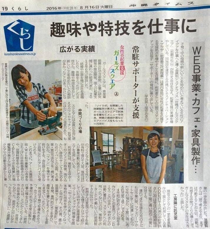 私が、つくる本の中にも、もちろん、今回新聞記事でも紹介されているDIYを趣味として始めて起業した木工作家「WOODNUTS」中村菜摘さんや、自分のお店づくりにDIYで取り組んだ島どうふ専門「CAFEソイラボ」瑞慶覧麻沙美さんの、自分らしい生き方や、働き方、彼女たちの事業にかける想いや魅力も掲載していきます