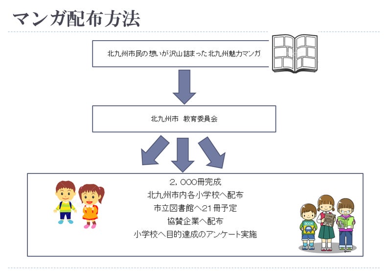北九州魅力本(マンガ)を各小学校へ配布をし、実際に子ども達にマンガを読んでもらって郷土愛を育んでいただきます。