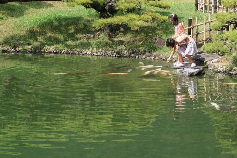 回遊式庭園といえば、池を中心としたまとまりのある庭園空間を次々に巡っていくことが特徴。そして、池といえば、やっぱり美しい錦鯉が泳いでいる図が、皆さん浮かんできませんか? 栗林公園でも、園内いろいろなところで錦鯉が優美に泳ぐ姿を楽しんでいただいています。