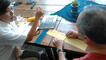 それぞれの地域に受け継がれる紋様を基本にレクチャー(左:知花花織の金城さん)