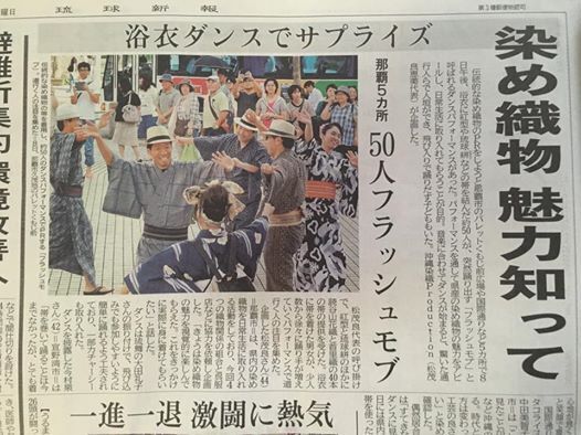 過ぎた5月には、沖縄のメインストリートであります国際通りで「浴衣姿50名のフラッシュモブ」を企画しました。沖縄の模様の浴衣「芭蕉に鳥、牡丹、いるか」発表を試みました。