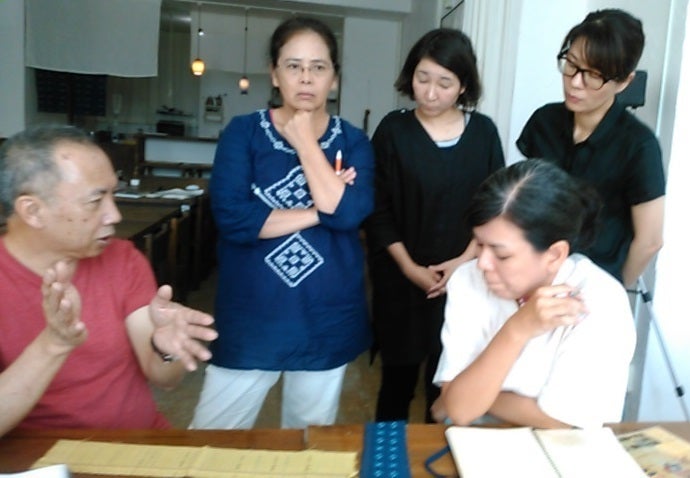 △色と紋様の組み合わせについてレクチャー(左は謝敷さん http://hiroshijashiki.com)
