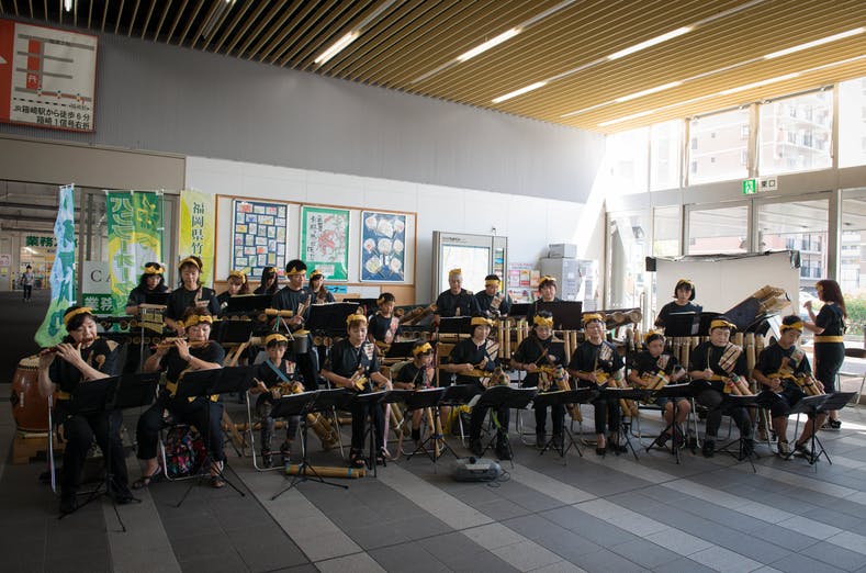 JR箱崎駅で行われたバンブーオーケストラによる演奏の模様