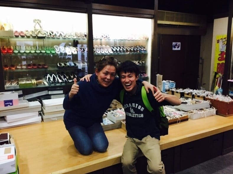 箱崎の大学通りにある戸部田はきもの店の店長と九大生のツーショット