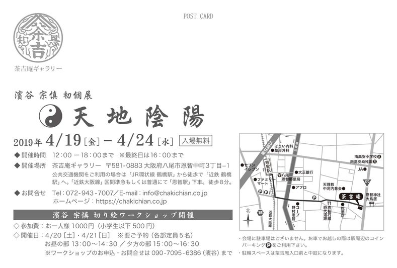 2019/03/29 14:15いよいよ、私、濱谷宗慎の初個展の開催内容とDM、ポスターイメージが決定いたしました!皆さま、4月19日(金)から茶吉庵ギャラリーでお会いできることを楽しみにしております!そして、クラウドファンディングも個展開催一週間前の4月11日が最終期日となっております!こちらも引き続き、何とぞ、ご支援、ご協力のほどどうかよろしくお願いいたします!4月の茶吉庵ギャラリーは切り絵作家、そして茶吉庵ギャラリーのギャラリストである濱谷宗慎の初個展『天地陰陽』を開催いたします。今回の初個展では「天と地」「陰と陽」「光と影」、森羅万象を構成する二つの要素をテーマに、切り絵を展示いたします。“気の流れ”“自然の営み”を切り絵作品を通じて感じてみてください。会期中、濱谷宗清により切り絵ワークショップも開催いたします! 濱谷宗慎 初個展『天地陰陽』 開催日時:2019年4月19日(金)〜24日(水)12:00 ~ 18:00まで(最終日は16時まで)※入場無料 開催場所:茶吉庵ギャラリー 〒581-0883大阪府八尾市恩智中町3丁目-1 公共交通機関をご利用の場合は「JR環状線 鶴橋駅」から徒歩で「近鉄 鶴橋駅」へ。「近鉄大阪線」普通、区間準急にて「恩智駅」下車。 徒歩8分。 濱谷 宗慎 切り絵ワークショップ開催:参加費:お一人様1000円(小学生以下500円):開催日:4/20[土]・4/21[日]※要ご予約 (各部定員5名)お昼の部 13:00~14:30 夕方の部 15:00~16:30 ※ワークショップのお申込・お問合せは090-7095-6386(濱谷)まで お問合せ Tel:072-943-7007/E-mail:info@chakichian.co.jp 備考:近鉄大阪線「恩智駅」下車 徒歩8分/会場に駐車場はございません。お車でお越しの際は駅周辺のコインパーキングをご利用下さい。/駐輪スペースは茶吉庵入口前と中庭になります。 もっと見る