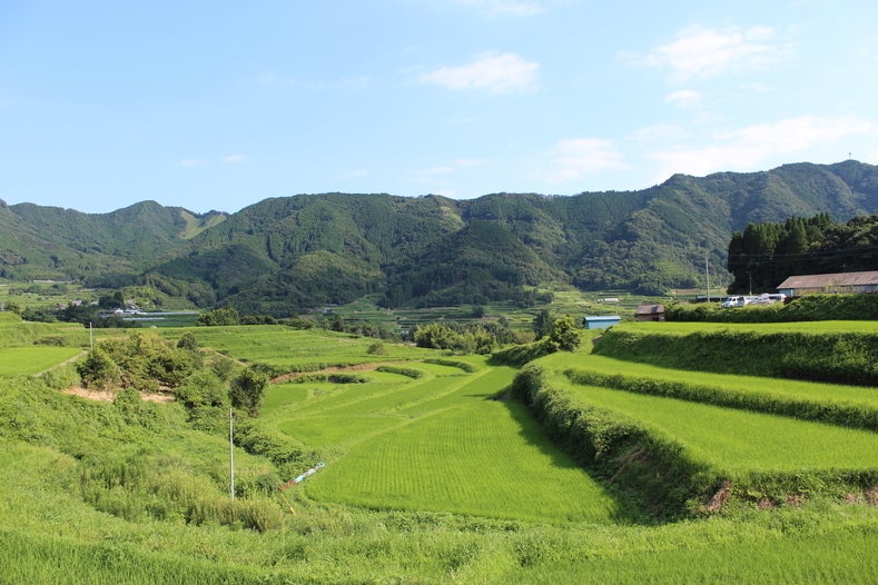 一方、高千穂は、一歩外に出て周りを見渡すと、幾重もの山の稜線が広がり、そのふもとには棚田が広がっています。