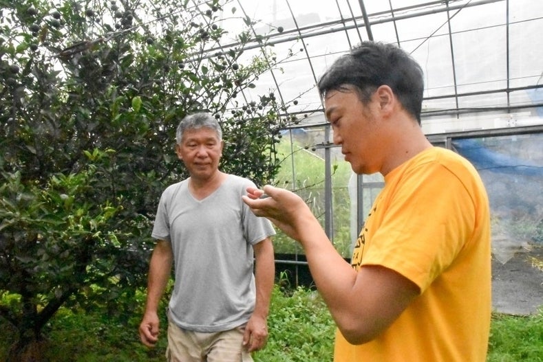 (▲左: へべすの生産者さん。右: 地域プロデューサーの齋藤さん)