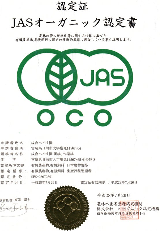 成合へべす園さんの商品は、この有機JASに認定されています。すべての商品が安全な規格適合品ですので、安心してご注文下さい。