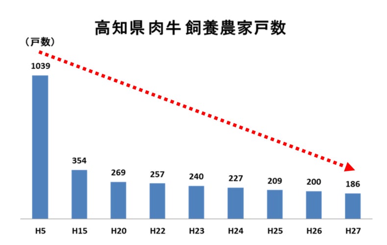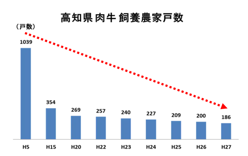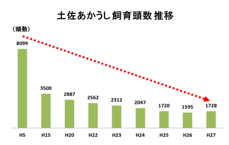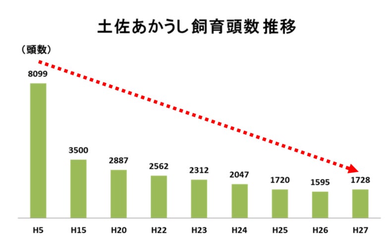 土佐あかうしの大幅な減少の原因には、高知県内の肉牛飼育農家の減少、および生産農家の黒毛和種への移行が考えられます。現在の牛肉市場での和牛肉の価格は、骨格筋内に脂肪が大理石状に入る脂肪交雑 (いわゆる霜降り) に大きく依存しており、遺伝的に霜降りが入りやすい形質を持つ黒毛和種が日本の和牛総頭数の約98% (158万頭) を占めるに至っています(土佐あかうしは、残念ながら僅か0.1%です・・)。