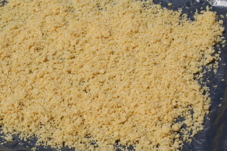 こちらが、牛たちが食べやすいように細かく加工した柚子果皮になります。良い香りがしますが柚子だけだと牛は苦くて苦手なので、他の餌とよく混ぜます。