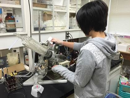 彼女は今、牛肉の脂肪中の脂肪酸組成を調べる実験を行っています。