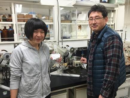 【脂肪酸の実験を指導してくださる水産利用学研究室の森岡先生とゆずチーム 岩佐】