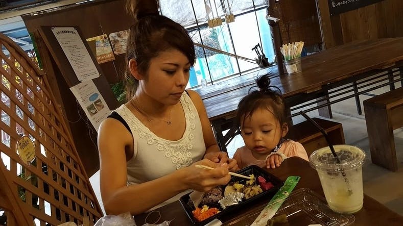 ガールズスクエアで、週2回食事の提供をしています。時には子供をおんぶしながら。