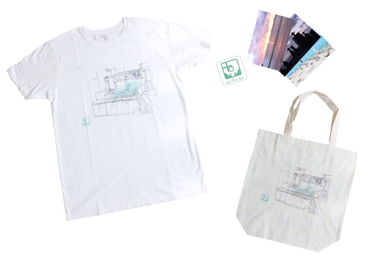 五島の素敵な風景を紹介するためのポストカードや、te to baのロゴステッカー、そしてte to baの象徴的な場所だった草が生茂る台所をモチーフにしたTシャツとトートバッグをお作りしました。