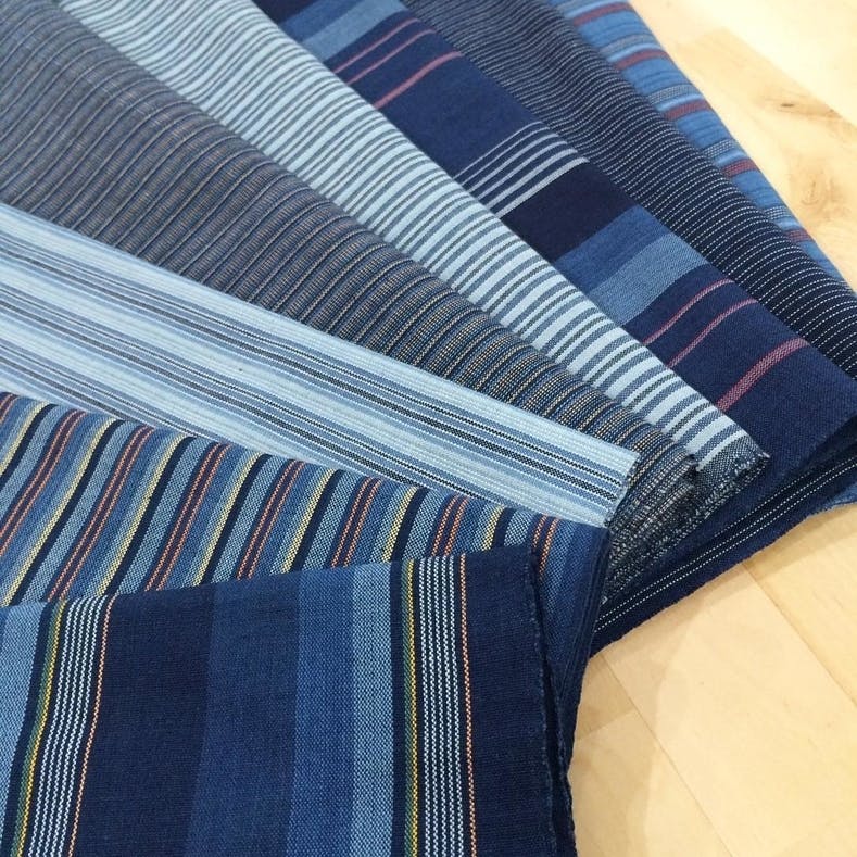私たちが偶然にも出逢うことができ、後世に伝えていきたいと思った島原木綿は、深く美しい藍染め糸を地に、縦縞が特長です。