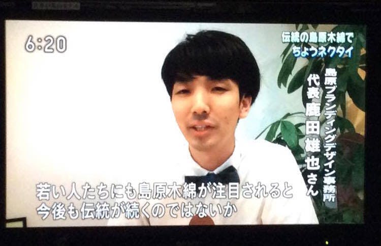 (NHKニュース内で島原木綿の蝶ネクタイ特集)