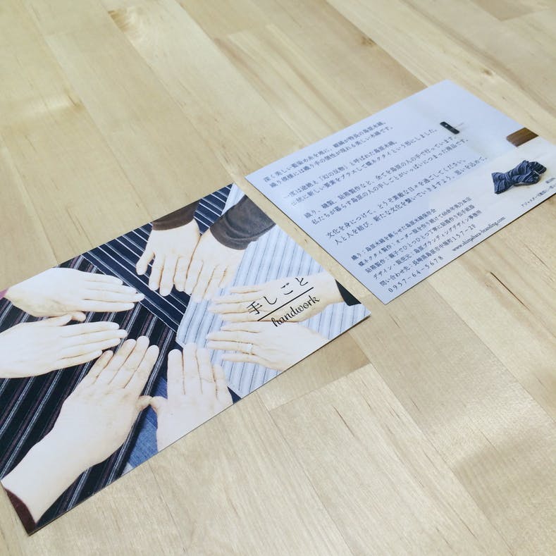 表は職人さん達の手と島原木綿の可愛い「手しごと(handwork)」写真、裏は島原木綿の説明とこのプロジェクトのメンバーの紹介となっています。