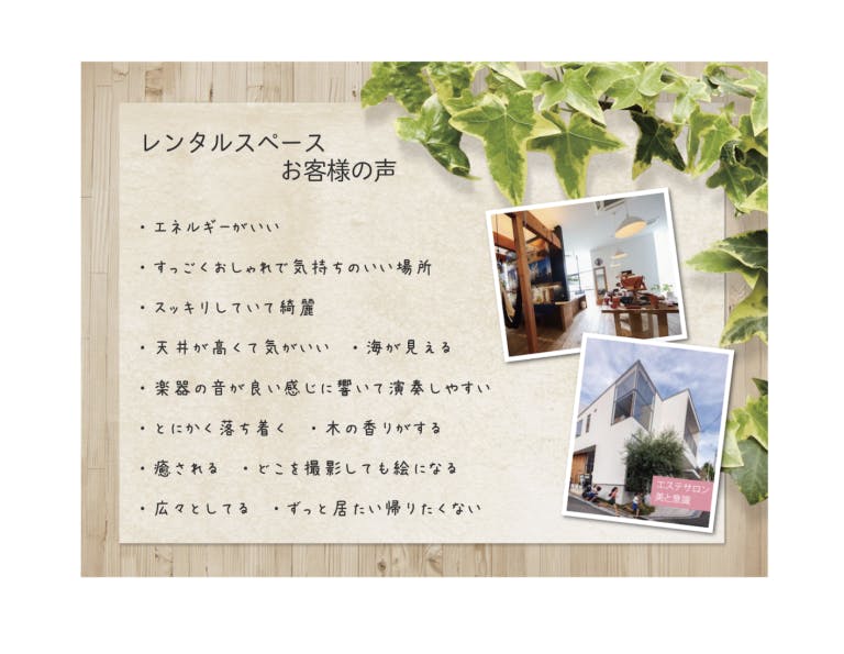 すでに立地や建物という条件は整っているので、必要とする人に知ってもらうこと、安心できる空間づくり、あなたのパワースポットになりたいという意図を広く伝えていき、既存概念に囚われない女性の生きかたの1つのパターンとしても、共鳴しながら自己実現していく方々と繁栄していきたいと思います。