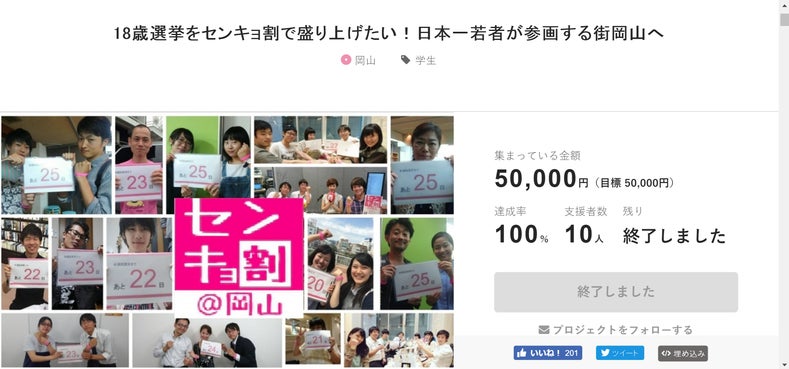 2016年第24回参議院議員のセンキョ割@岡山。FAAVO岡山にてクラウドファンディング達成。