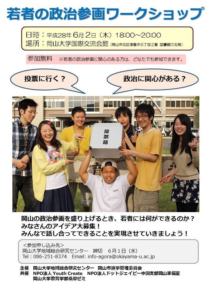 岡山大学では、今年の4月から政治について考える特別講義「若者と政治 大学生として18歳選挙権時代を考える」実践デモグラティックラーニングが行われています。教壇に立つのは東京で若者と政治をつなぐ活動を行う、特定非営利活動法人YouthCreate代表の原田謙介さん。講義ではセンキョや政治への参画や知識について基礎から学び、何より自分たちに何が実践できるかを深く知り、考えます。この実践デモグラティックラーニング初回講義には『センキョ割@岡山』はもちろん、若者と政治をつなぐ活動をしている、特定非営利活動法人ドットジェイピーのメンバーも参加し、大いに盛り上がりました。