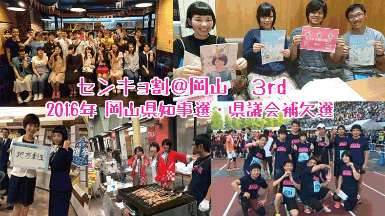 2012年衆議院議員総選挙の時に横浜でスタートし、岡山では2015年の統一地方選挙で実施しました。選挙に行くことで、『センキョ割』提携店から割引やオマケなど「お得なサービス」が受けれることができるイベントです。2015年には多くのメディアに紹介され、若者が選挙に行くキッカケづくりに貢献しました。 現在では全国各地で、センキョ割活動が行われています。