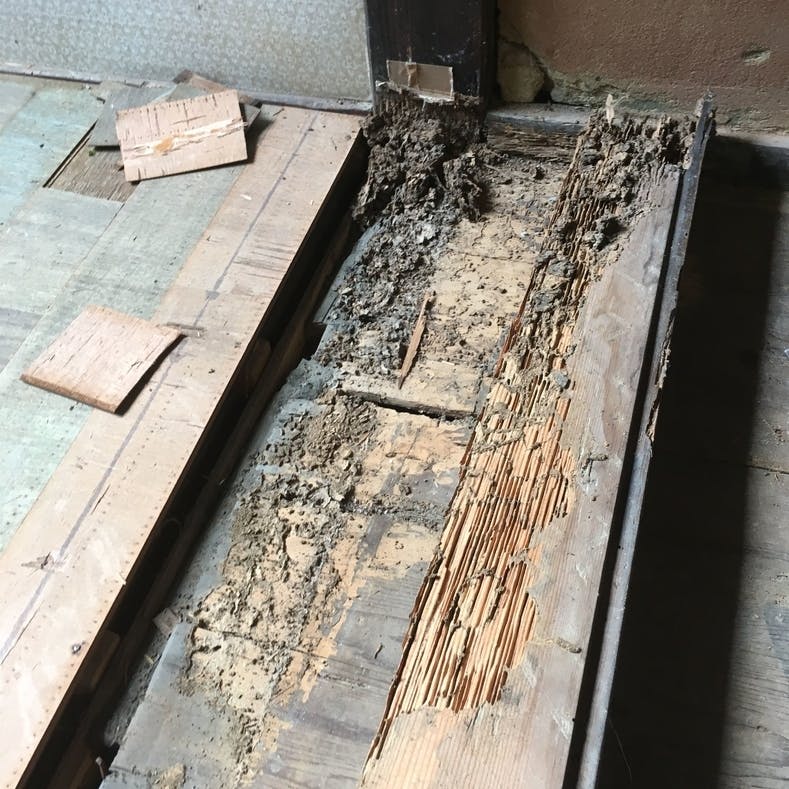 ▲シロアリに食われた床板と敷居