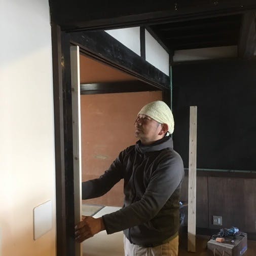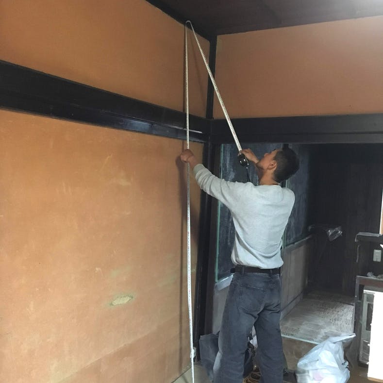 ▲壁の漆喰を塗り替えるため、左官屋さんに来てもらってサイズを計測中