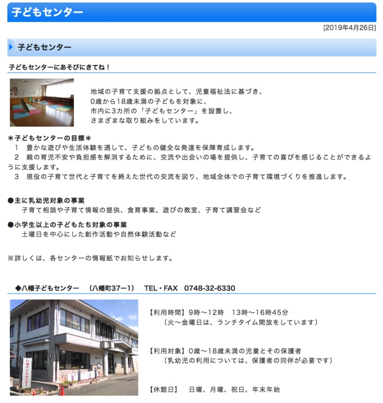 事前に情報を見ると、近江八幡市に3つある子どもセンターは土曜日も開館していてビックリ!わたしが住む日野町には、土日に開館している子育て関係の施設はありません。「家族が土日も仕事」という家庭もあると思いますので、1人だけで子どもを見ることがしんどい時があります。そういうときに土曜日も開館している室内遊びができる施設があるのは有り難いです。