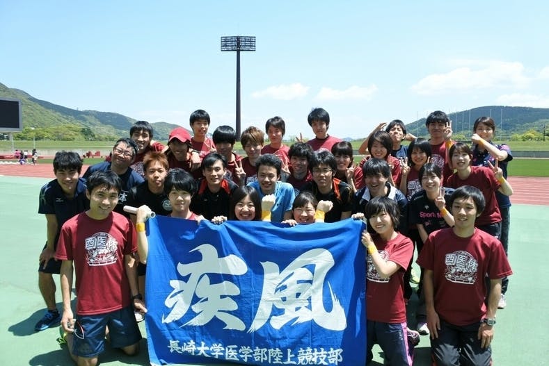 こんにちは、私たちは長崎大学医学部陸上部です。医・歯・薬学部の学生約30人で構成されており、普段は部員全員で陸上に励んでおります。