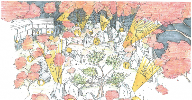 岩陰からLED投光機4台を利用し、地面から上へ向かって光を当てることで、落紅葉も映し出し、幻想的な雰囲気を演出したいと考えます。